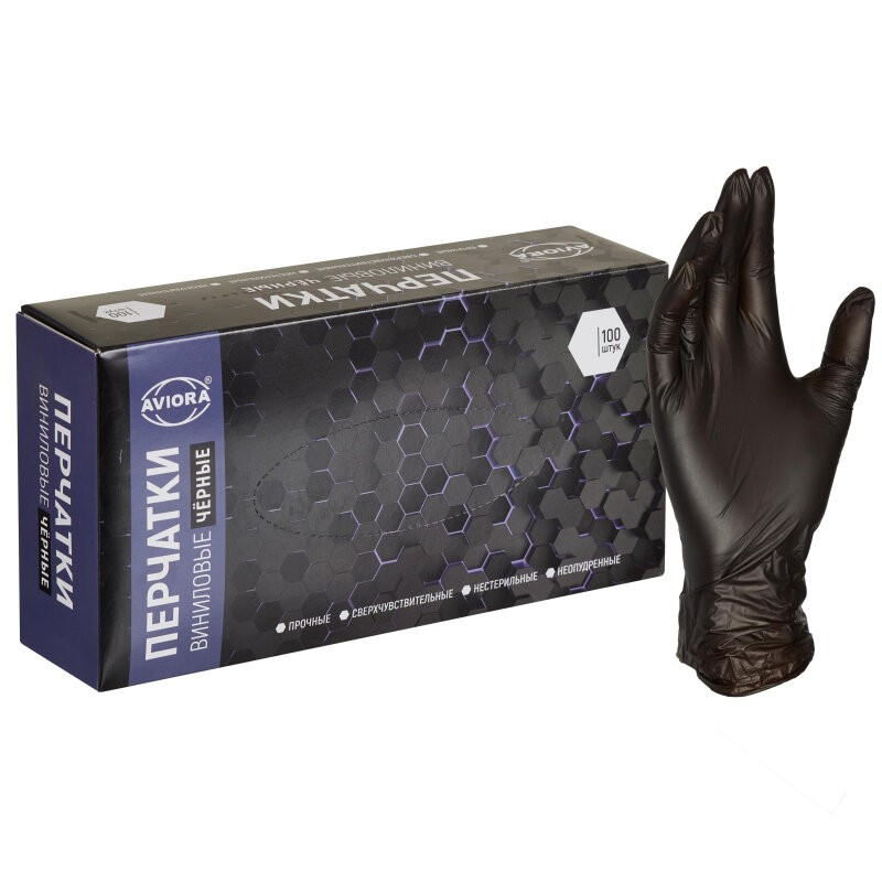 Aviora Перчатки виниловые, черные, неопудренные, одноразовые, размер L, 100 шт. в упаковке