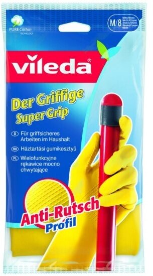 Vileda Super Grip Резиновые перчатки хозяйсвтенные универсальные с рельефным профилел и внутренним хлопковым напылением Размер 8 M Средний