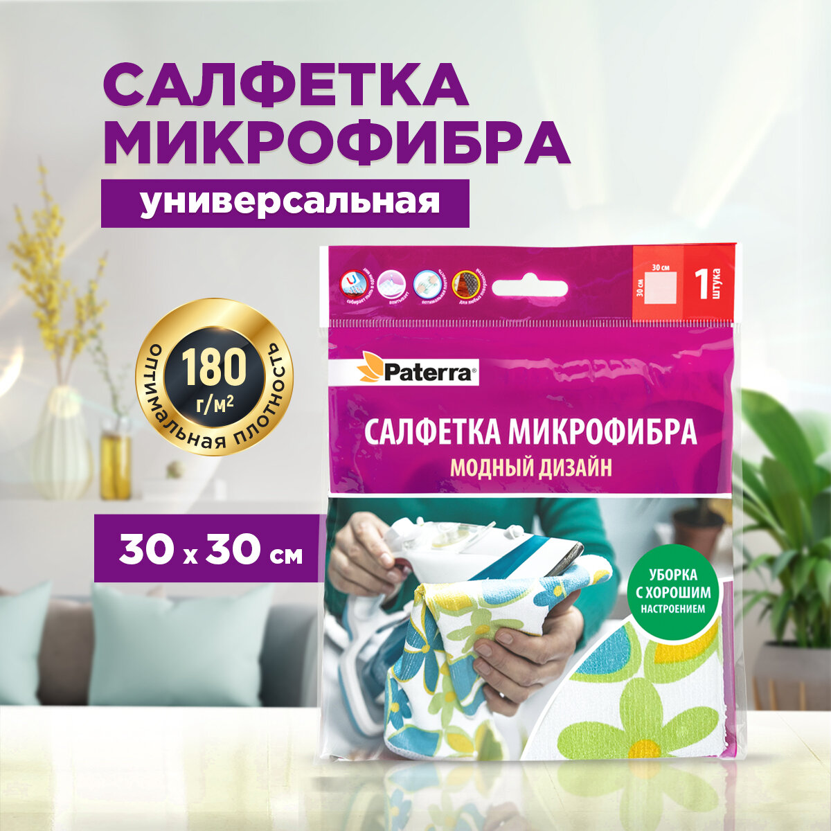 Салфетка микрофибра модный дизайн PATERRA 30 х 30 см в пакете 406-014