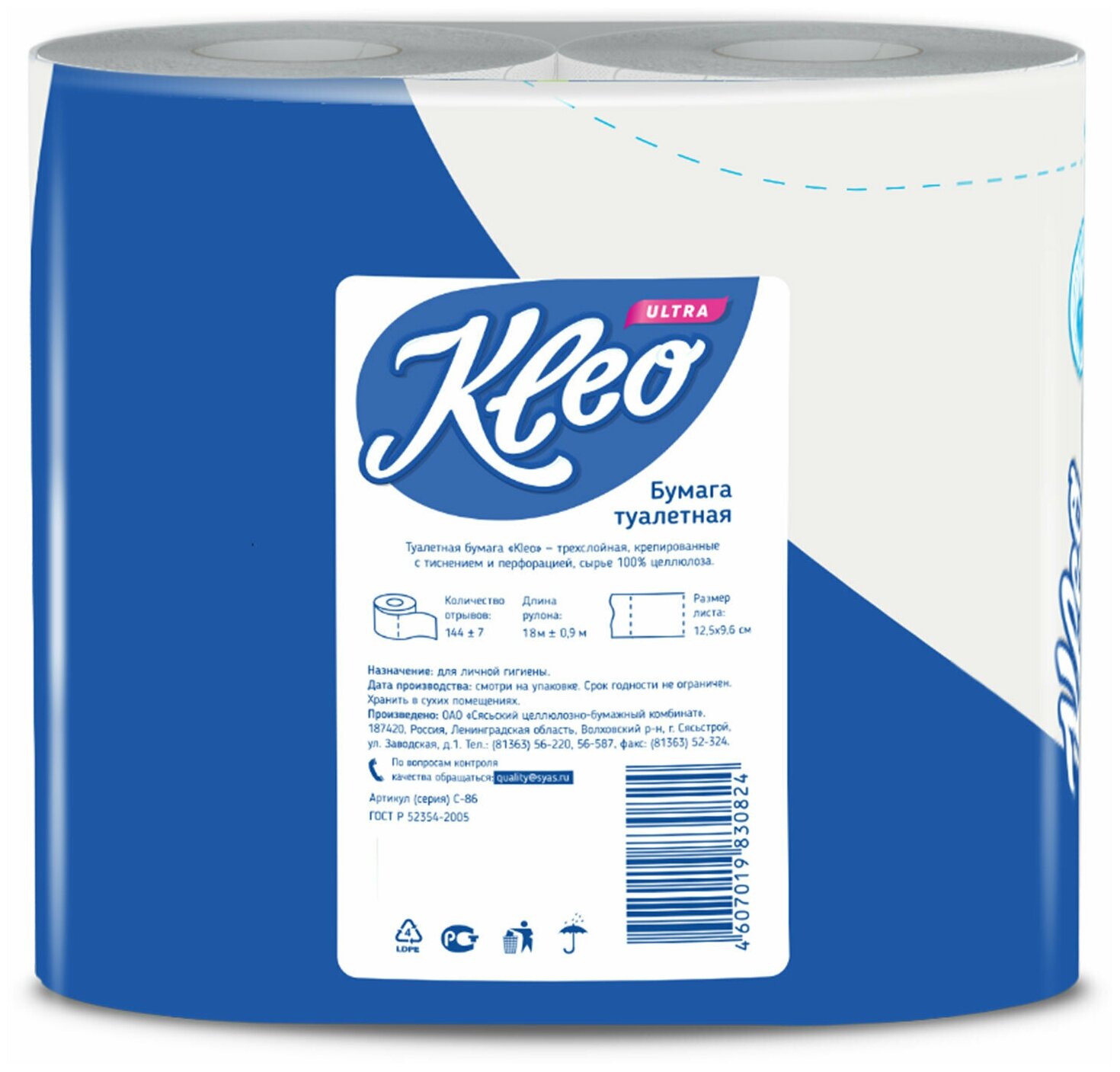 KLEO Туалетная бумага Ultra 3 слоя 4рул. белая