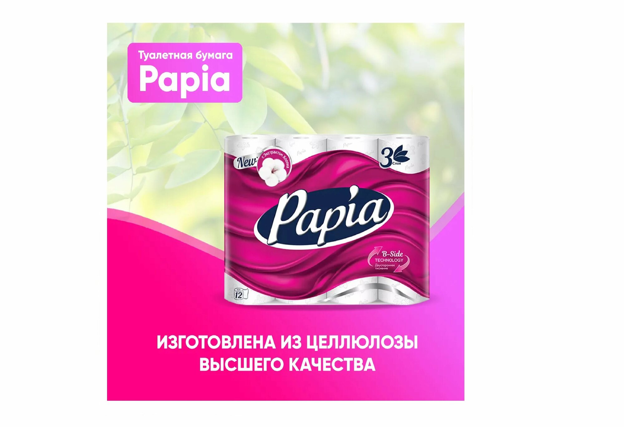 Туалетная бумага трехслойная PAPIA с экстрактом хлопка, 8 рулонов, 3 слоя / Папиа