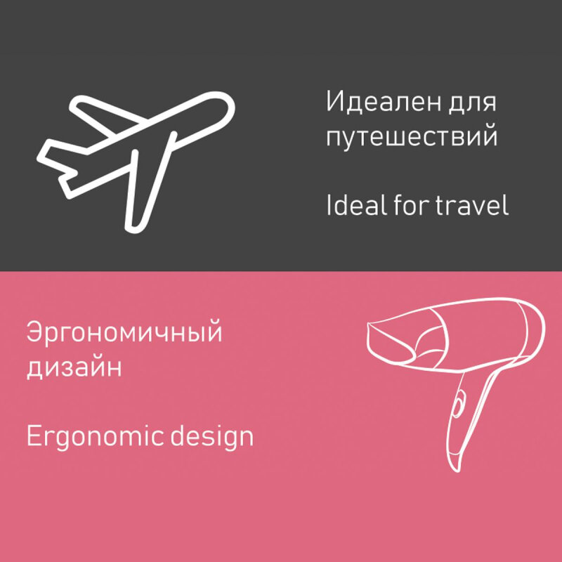 Часто езжу по работе в командировки, искала именно дорожный фен. Этот удобный, ручка складывается, лишних наворотов нет, просто сушит волосы. Зато делает это быстро и бережно, пересушенных кончиков нет. Безопасный, при перегреве отключается и не включишь, пока не остынет.