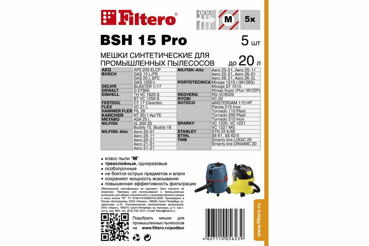 Мешки для промышленных пылесосов Bosch, Karcher, корвет, NILFISK-Alto, Ryobi, Sparky, Hilti, DeWalt, Flex, Stihl Filtero BSH 15 Pro (5 шт) из микроволокна. BSH 15 Pro