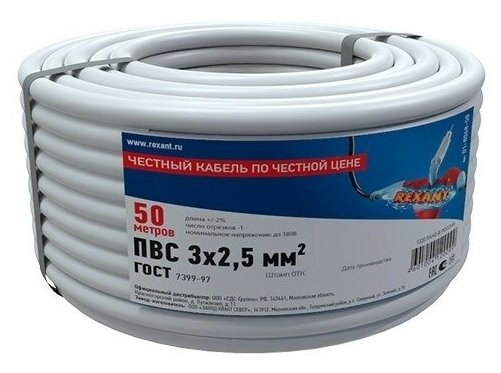 Провод электрический Rexant 01-8048-50 Провод соединительный ПВС 3x2,5 мм, длина 50 метров, ГОСТ 7399-97, катушка