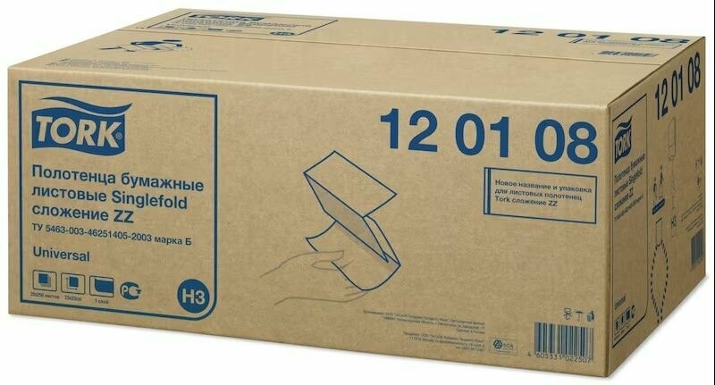 Промо H3 Tork Universal листовые полотенца сложение ZZ, Система H3 - Полотенца сложения ZZ и С, 23см х 23см., 1 слойные, белые с тиснением , 5000 листов, 20 штук в коробке (120108)