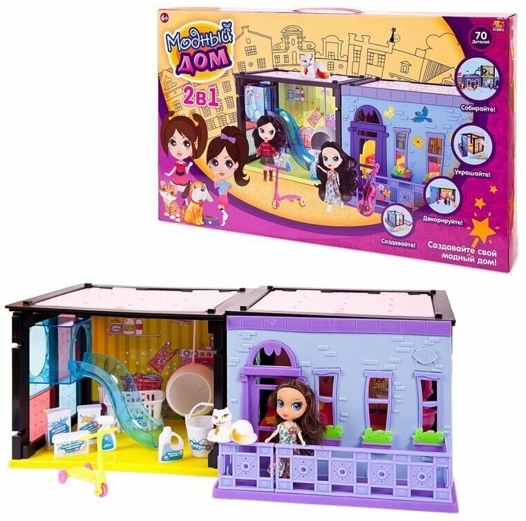 Дом для кукол ABtoys "Модный дом", 2 в 1, с куклой и мебелью, 70 деталей, в коробке (PT-00853)