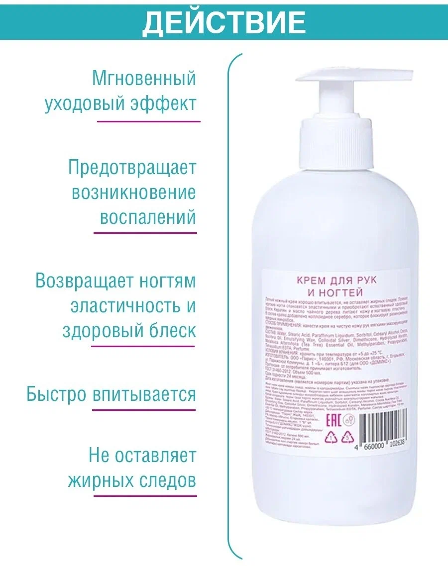 Крем для рук и ногтей с кератином, маслом чайного дерева и серебром, 500 мл