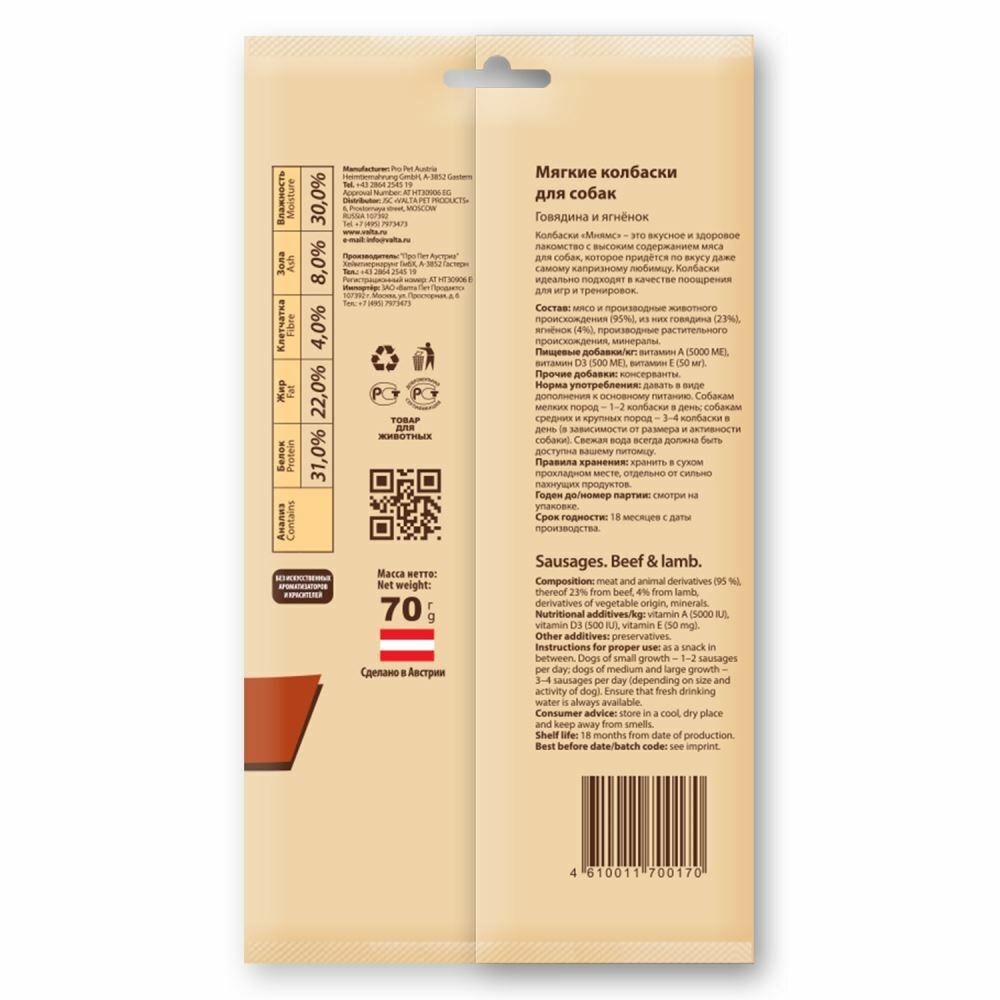 Мнямс 700170 Мягкие колбаски д/собак Говядина и Ягненок 70г