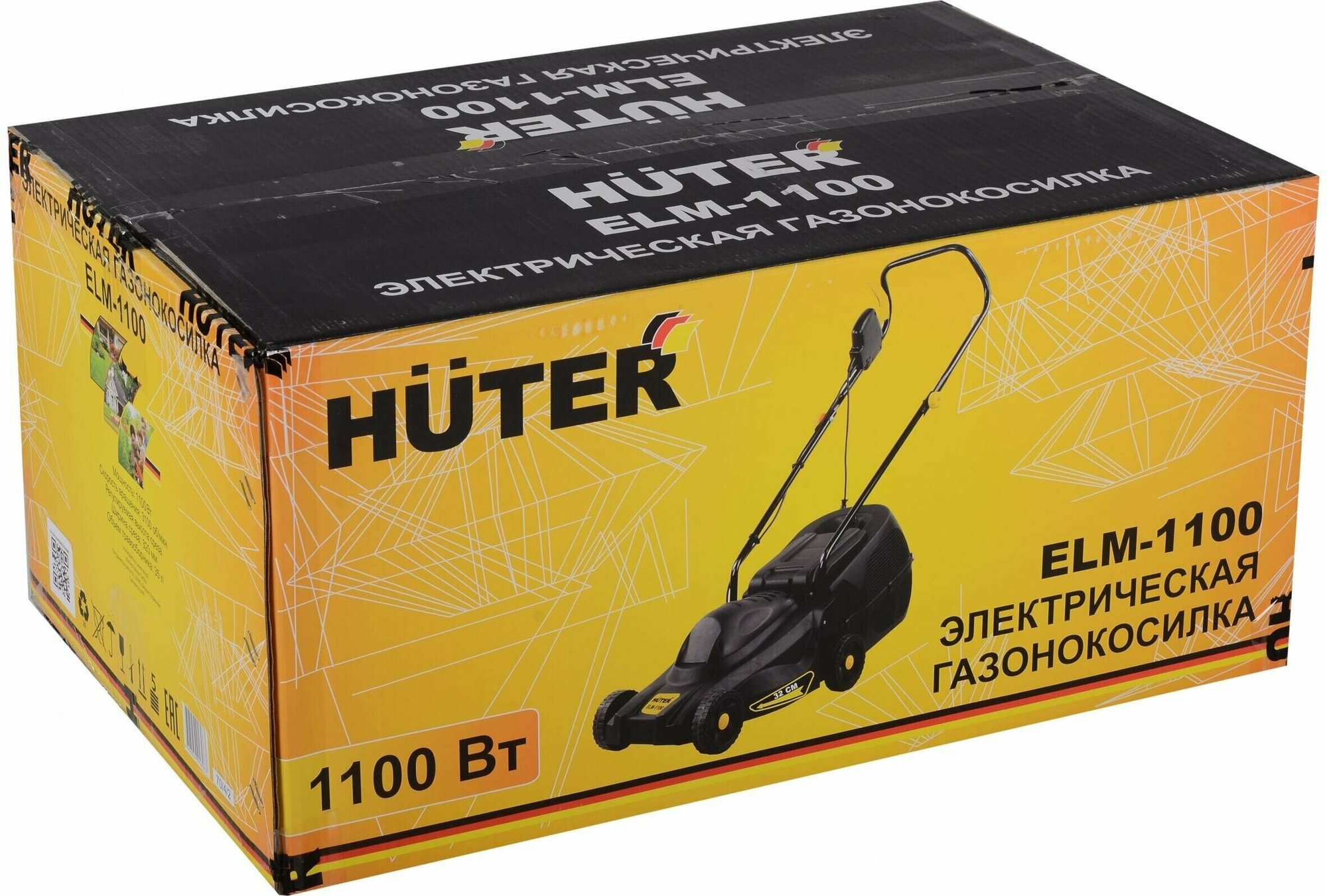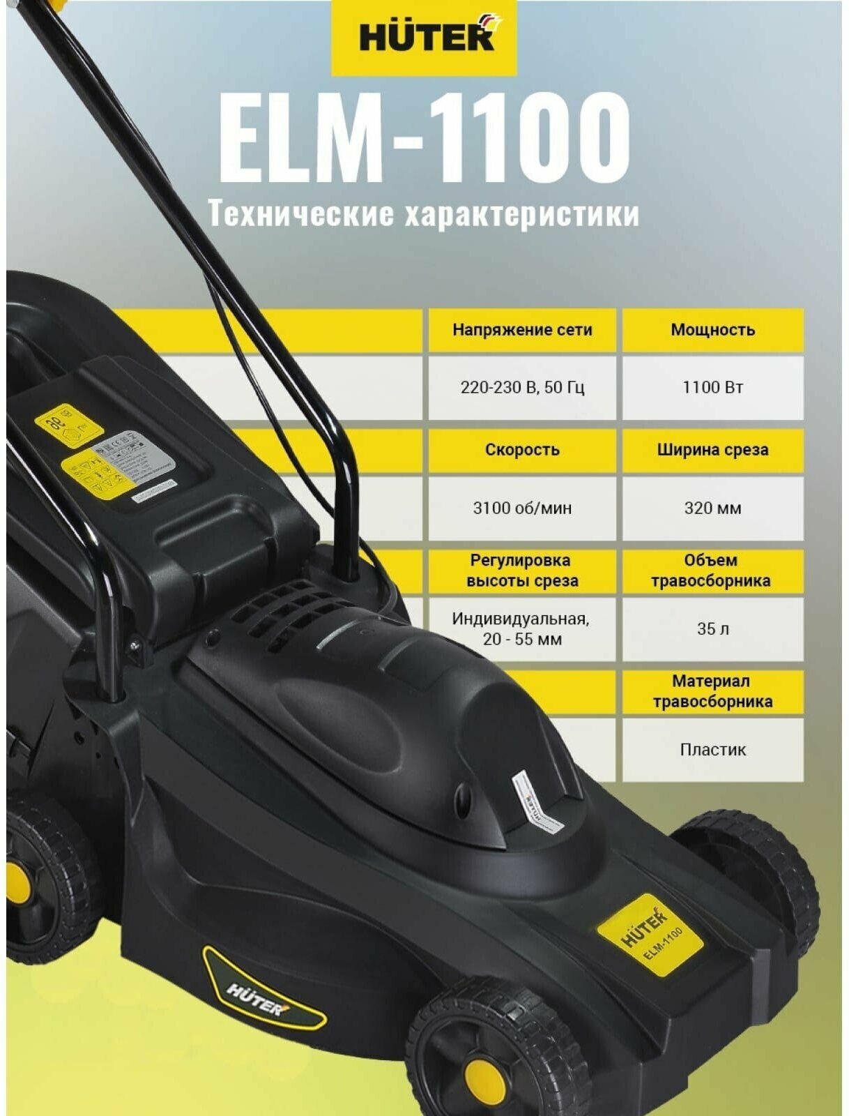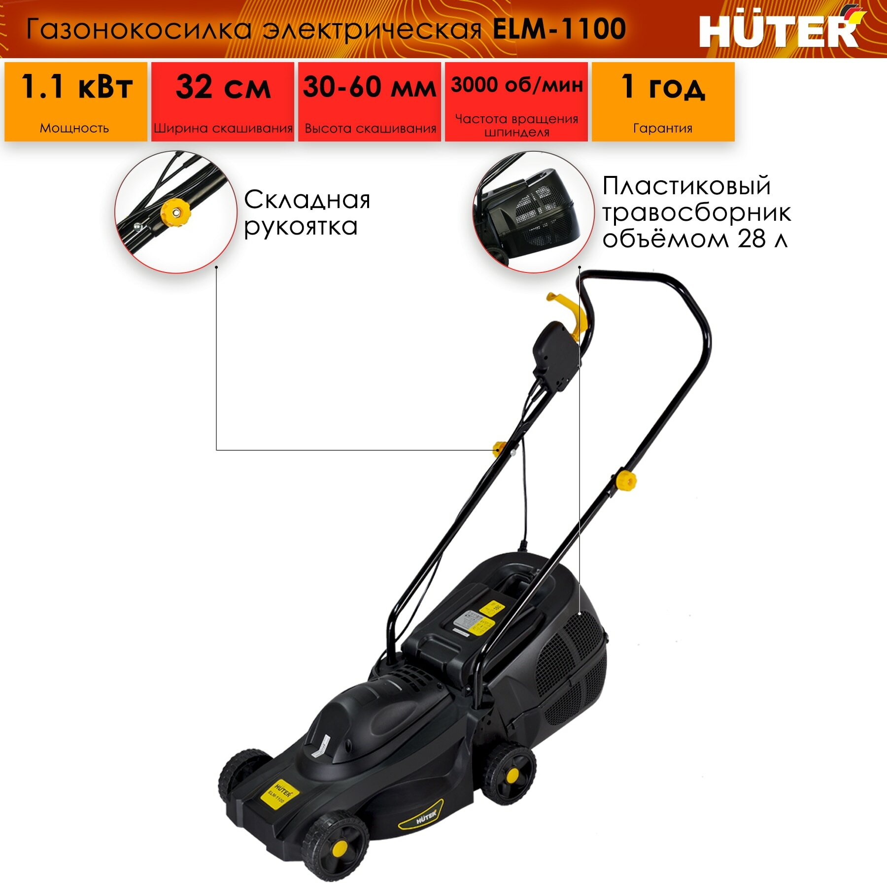 Газонокосилка HUTER сетевая, ELM-1100, 1100 Вт, 3100 оборотов в минуту, ширина скашивания 32 см