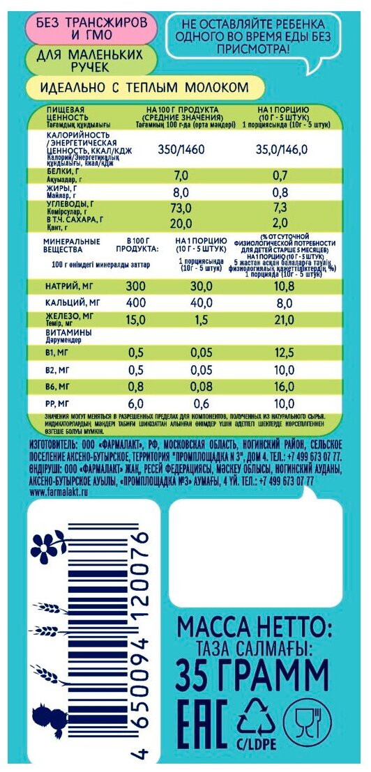 Печенюшки на вкус сладенькие, с ванильным ароматом, хрустящие, приятного золотистого цвета. Легко растворимые, прям тают во рту. Также легко растворимы в теплой жидкости, мы пробовали с молоком. С милыми названиями на каждой печеньке: теплота, нежность, любовь и т.д.. В составе витамины и минеральные вещества, что немаловажно для растущего организма. В ручку печеньки помещаются легко, ребенку очень удобно их держать. Ребенок скушал с удовольствием! |