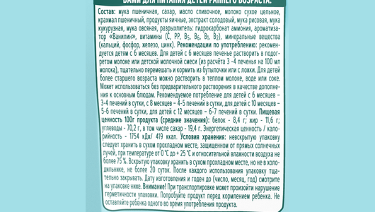 Печеньки 4х видов ,на задней стороне есть игра для деток ,вкус Недостатки: Пищевая добавка Е503 Фруто Няня детское печенье мультизлаковое! Первый раз взяла дочке это печенье ,все кто пишут что с 6 месяцев нельзя давать вы вообще читаете инструкцию ????? Там написано что с 6 месяцев печенье нужно РАЗМОЧИТЬ В ТЕПЛОМ МОЛОКЕ ,ИЗ РАСЧЕТА 3-4 ПЕЧЕНЬКИ НА 100МЛ МОЛОКА! Целое печенье дается деткам постарше и то под присмотром родителей На вкус приятное печенье ,дочке 1 год ,кушает по 2-3 печеньки в день и то половину выплевывает ,больше давать пока боюсь Что касается состава он не плохой ,но смущает только гидрокарбонат амония или пищевая добавка ( Е503), в переводе на наш язык это вместо соды или дрожжей, хотя в составе указан разрыхлитель ,что та же сода ! |