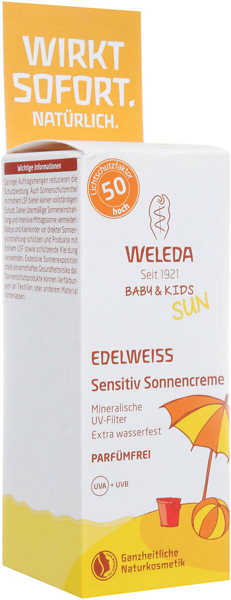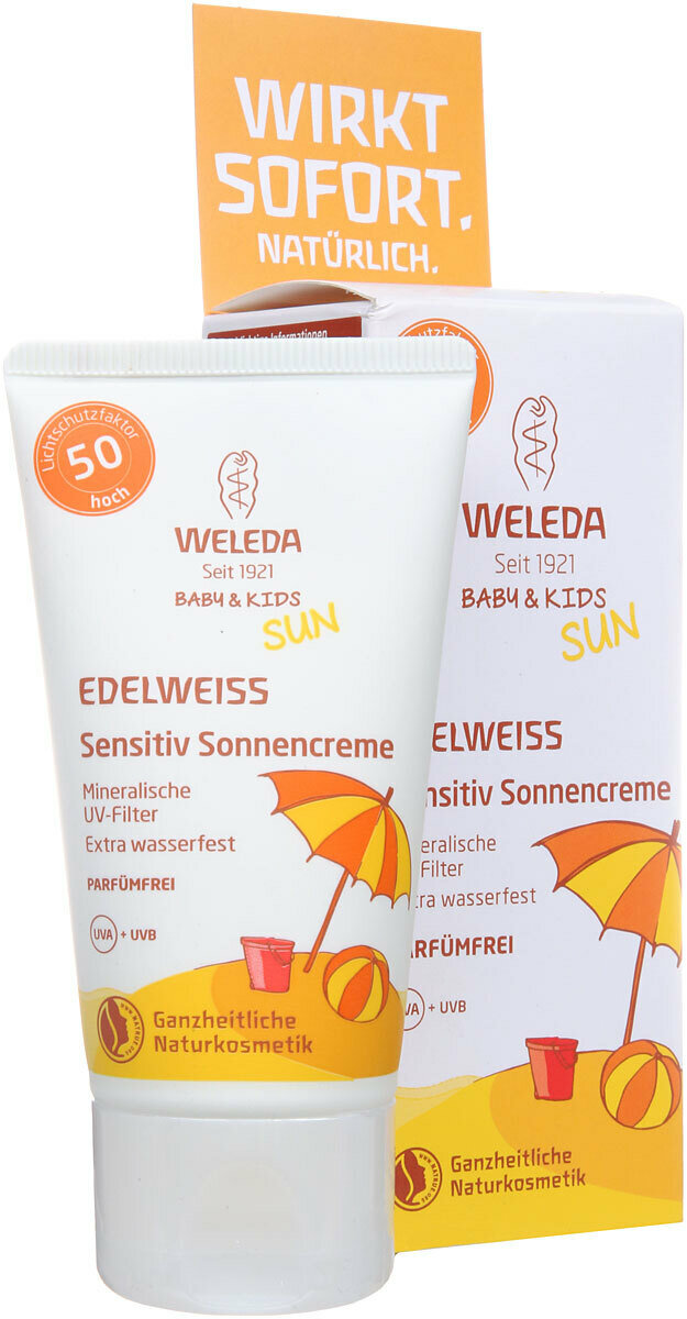 Weleda Солнцезащитный крем для младенцев и детей SPF 50 Weleda Baby & Kids Sun Edelweiss, 50 мл. надежная защита нежной чувствительной кожи от солнечных ожогов и негативного воздействия внешней среды.