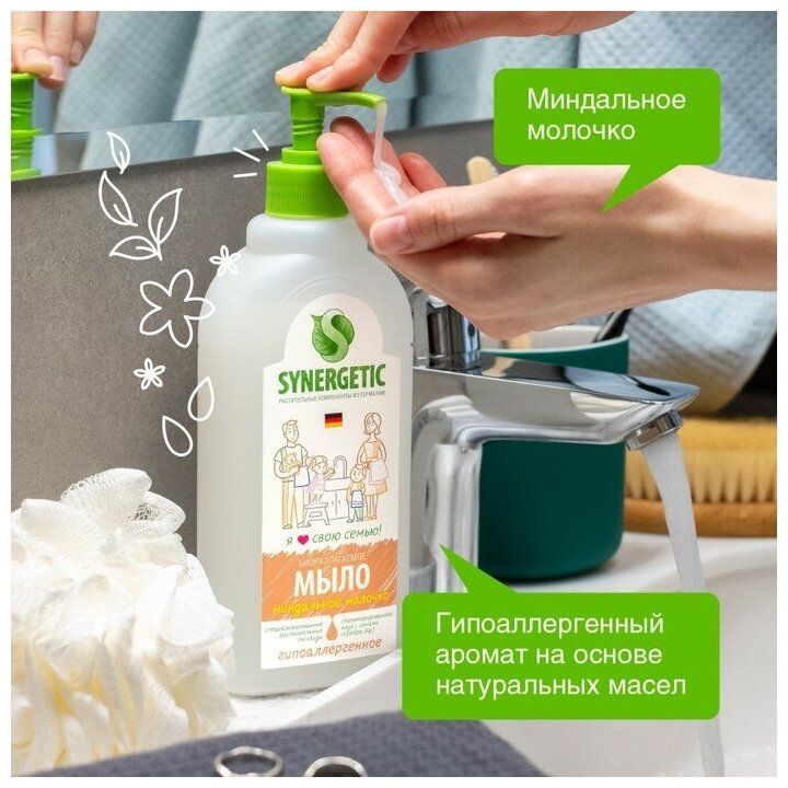 Квант продажи 2 ед. Мыло жидкое 500 мл SYNERGETIC «Миндальное молочко», гипоаллергенное, биоразлагаемое, дозатор