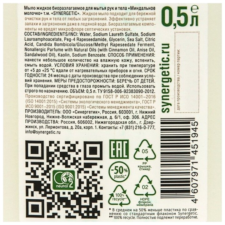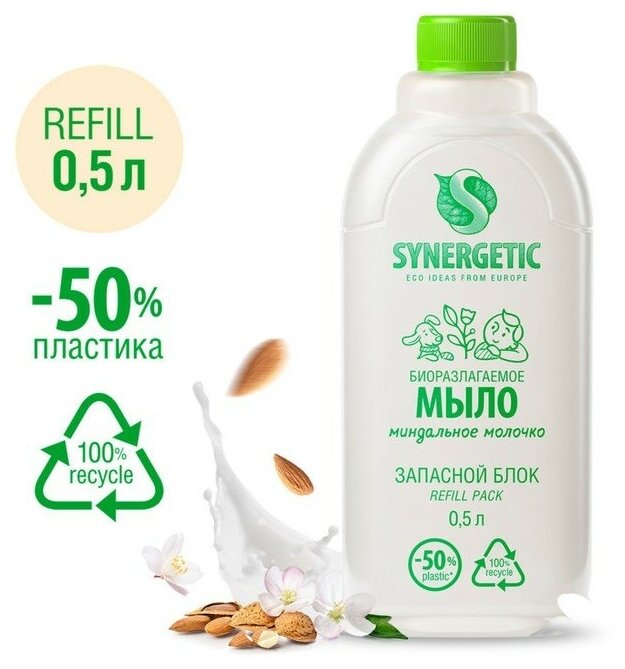 Мыло жидкое биоразлагаемое Synergetic, Миндальное молочко, refill pack, 0,5л 7802078