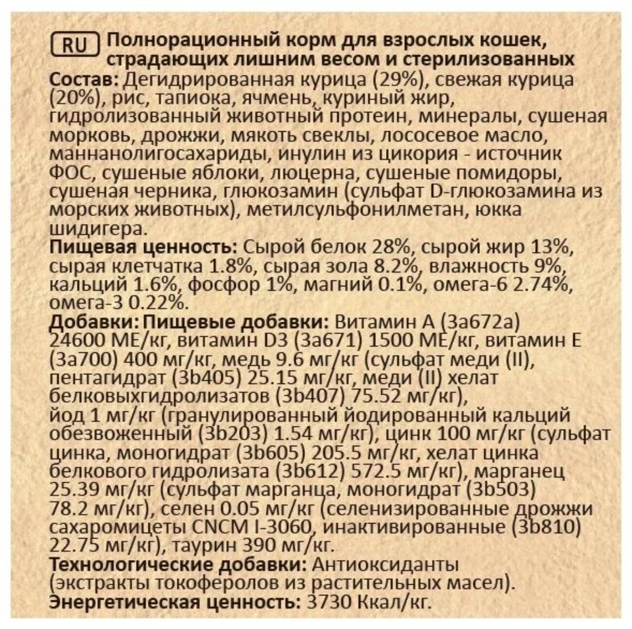 Сухой корм BROOKSFIELD для кошек с избыточным весом и стерилизованных с курицей, 400г.