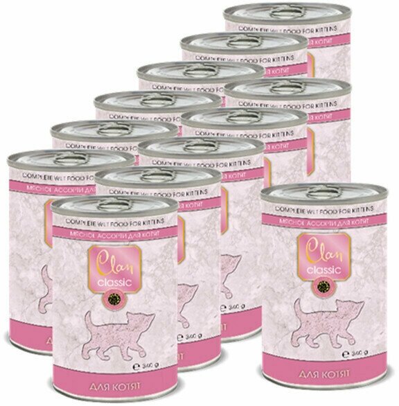 Купить Корм полнорационный консервированный Clan CLASSIC для котят, Мясное ассорти, 340г, 12 шт.