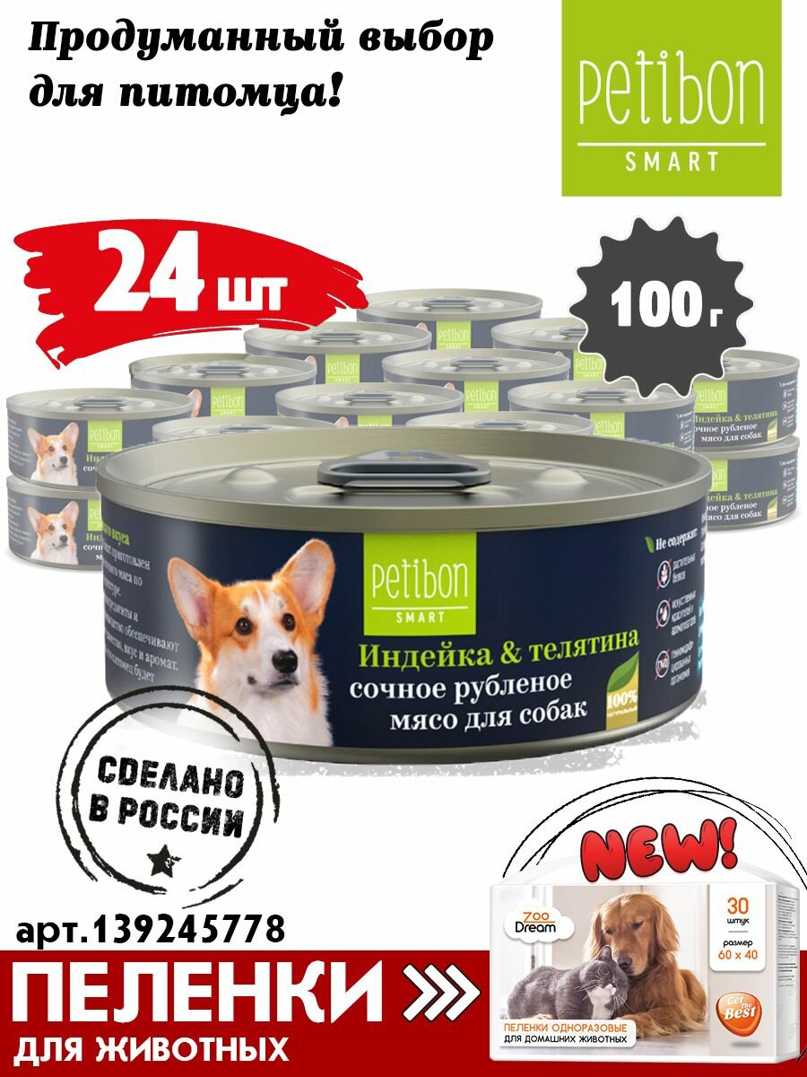 Petibon Smart влажный корм для взрослых собак, рубленое мясо с индейкой и телятиной, в консервах - 100 г х 24 шт