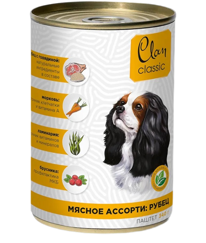 Корм полнорационный консервированный Clan CLASSIC для собак, Мясное ассорти с рубцом, 340г, 6 шт.