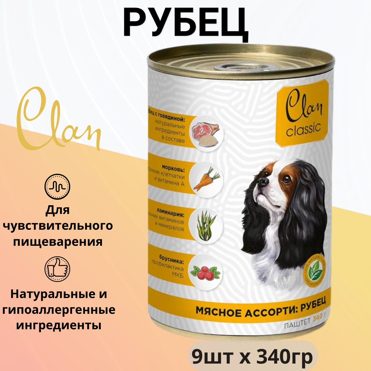 Влажный корм для собак CLAN Classic, мясное ассорти, рубец 9 шт. х 340 г