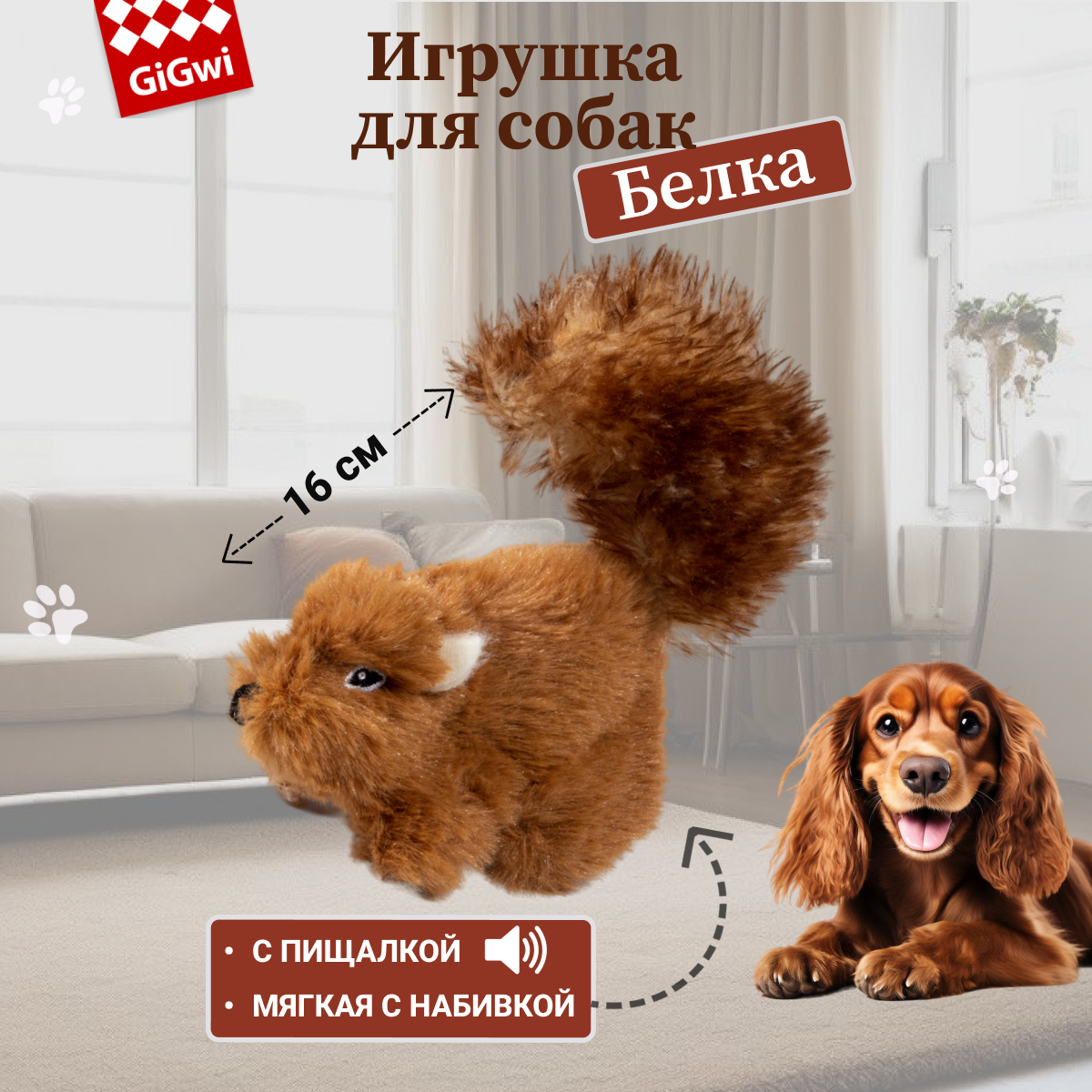 Игрушка от бренда Gigwi Белка с пищалкой 16 сантиметров дял кошек и собак