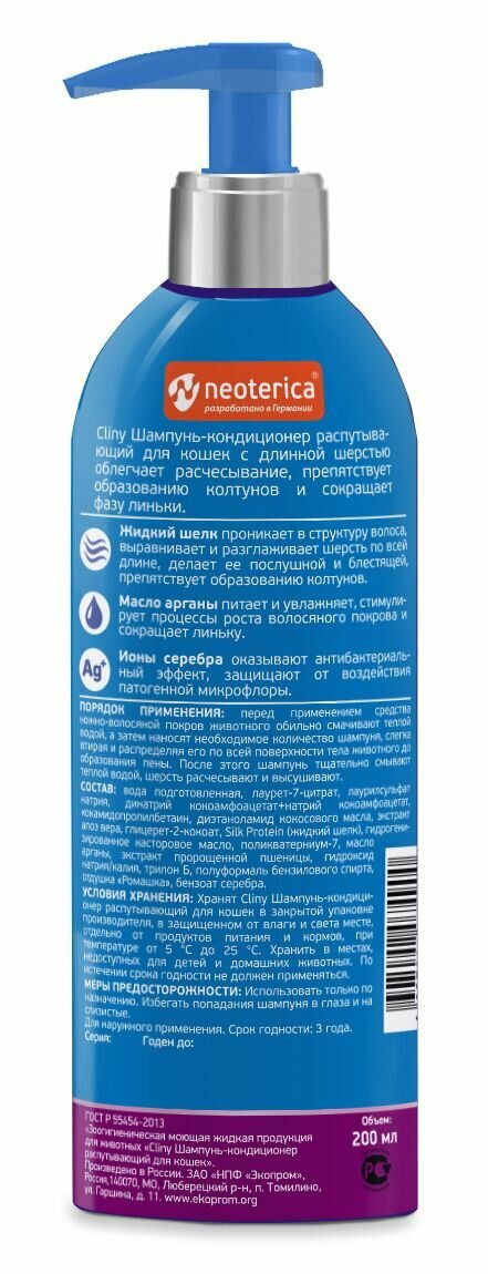CLINY "Роскошный шелк" шампунь-кондиционер для длинношерстных кошек, 200мл