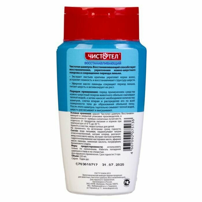 Шампунь для кошек и котят разных пород / гипоаллергенное средство для ухода за кожей и шерстью животных Чистотел Восстанавливающий 220 мл
