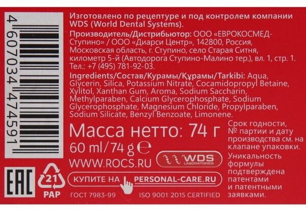 | Минусы: | Будьте осторожны! Паста заявлена для чувствительных зубов, но по факту она усиливает эту самую чувствительность, портит эмаль. Испортила мне и многим другим людям (почитайте настоящие отзывы в Интернете- на всю продукцию немало жалоб). Это "особенность" всех паст Рокс. Положительные отзывы на многих сайтах - работа троллей, маркетинговых отделов. Ни к какой Швейцарии (как написано на упаковке) Рокс отношения не имеет, производится она в России. |