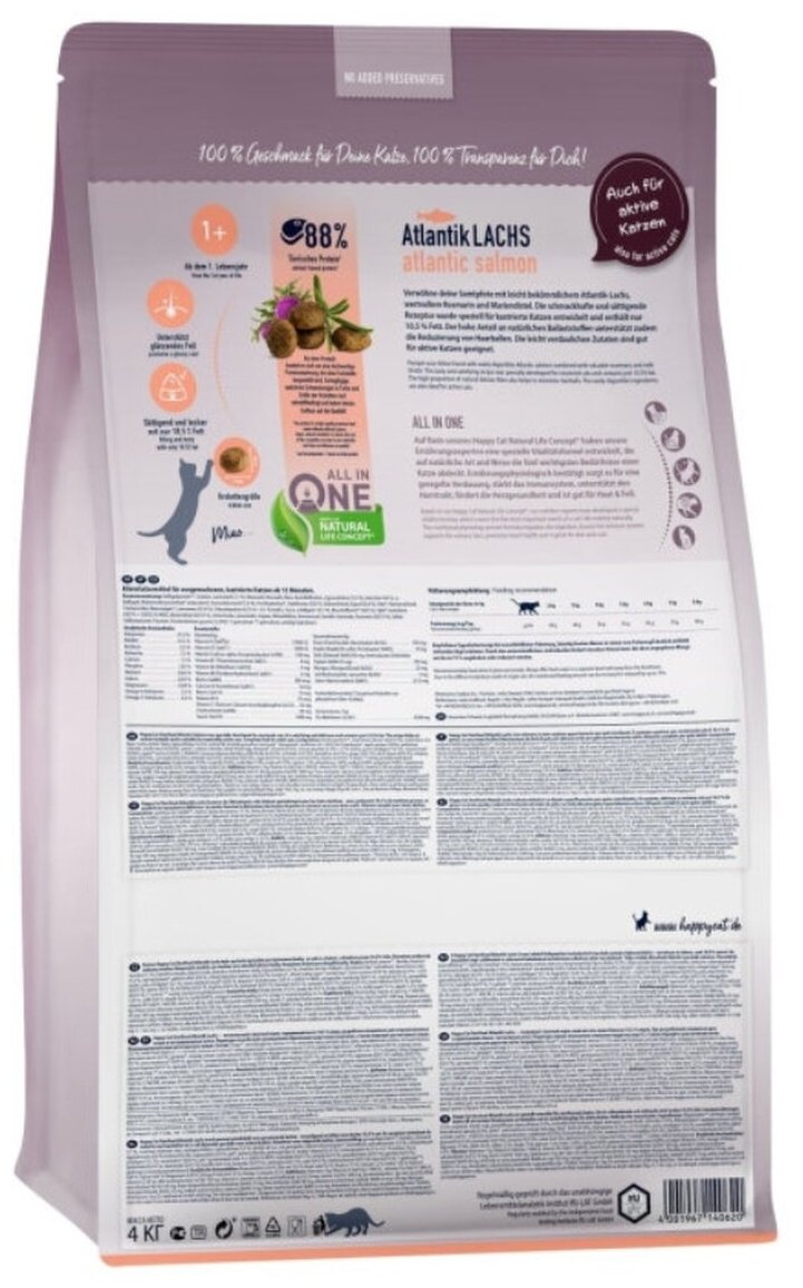 Сухой корм для кошек Happy Cat Хэппи Кэт Эдалт Стерилайзд Атлантический Лосось 4 кг