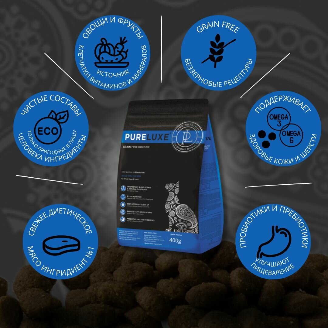 Сухой беззерновой корм PureLuxe Пурлюкс класса холистик для привередливых кошек всех пород на любых этапах жизни, со свежей курицей, 400 гр.