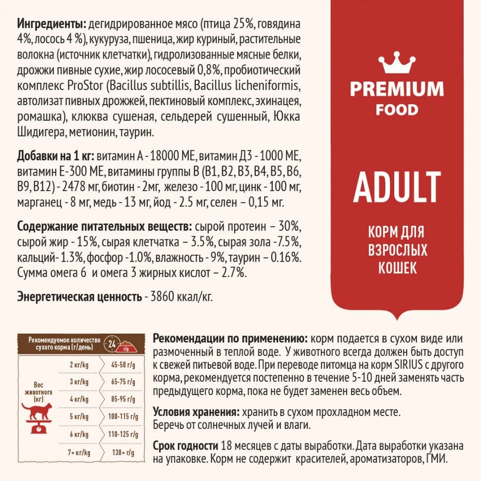 Сухой корм сириус SIRIUS PREMIUM для взрослых кошек, лосось и рис, 10 кг