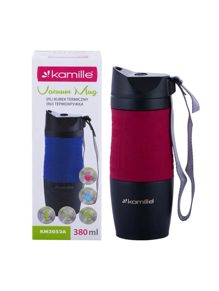Термокружка 380 мл. из нержавеющей стали Kamille KM 2052A с TPR-вставкой и ремешком (2052A / красный)