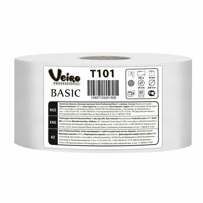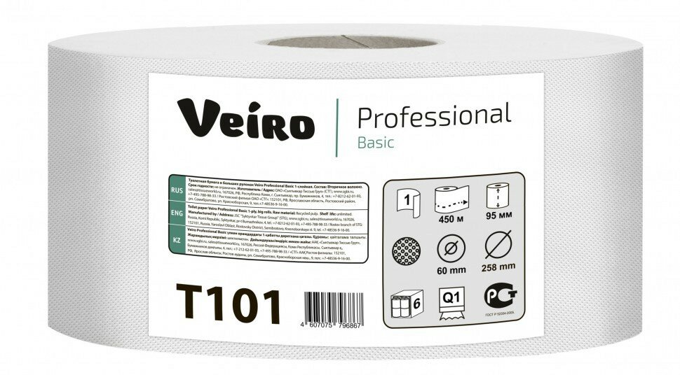 T101 Туалетная бумага в больших рулонах Veiro Professional Basic однослойная (6 рул х 450 м)