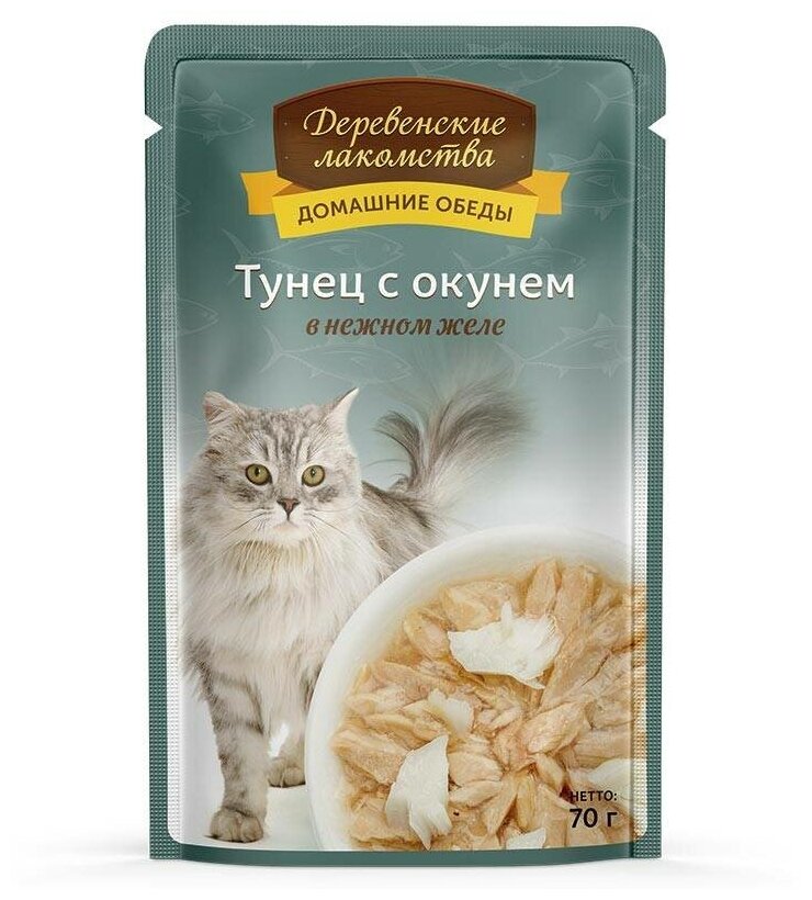 корм для кошек Деревенские лакомства Домашние обеды, беззерновой, с тунцом, с окунем 70 г (кусочки в желе)