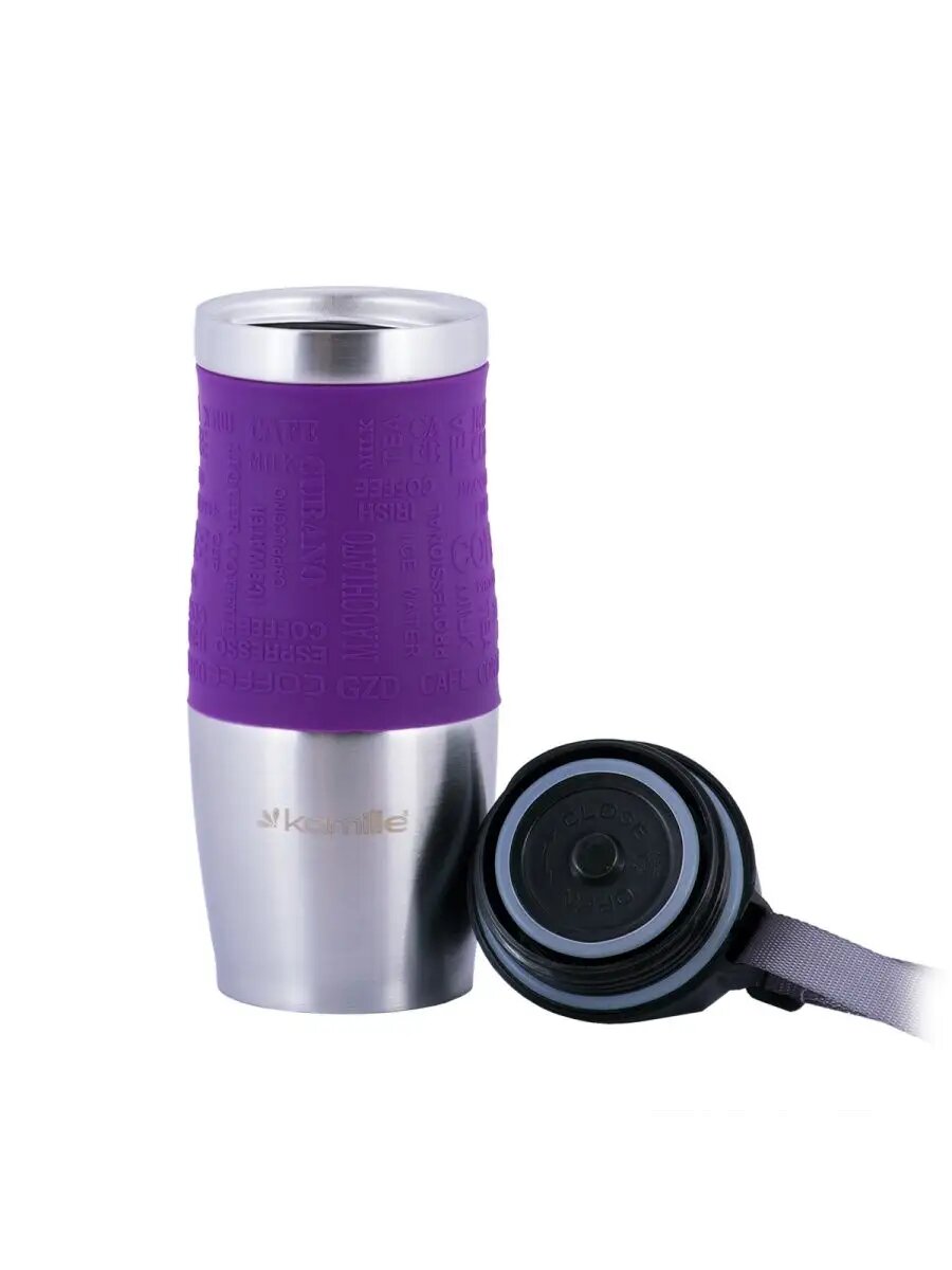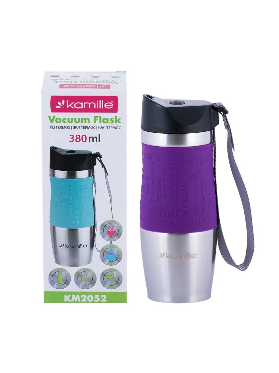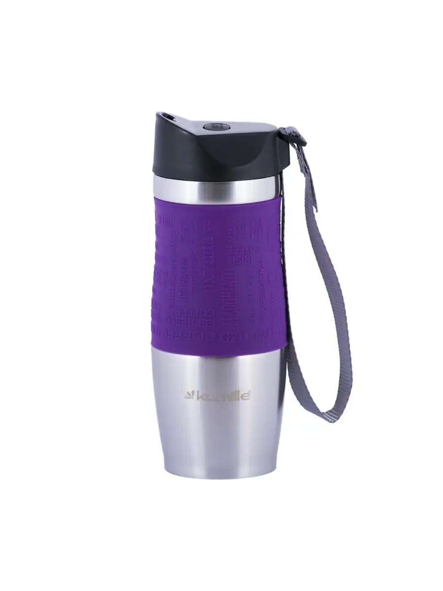 Купить Термокружка Kamille с TPR-вставкой и ремешком (фиолетовая) 380 мл (2052)