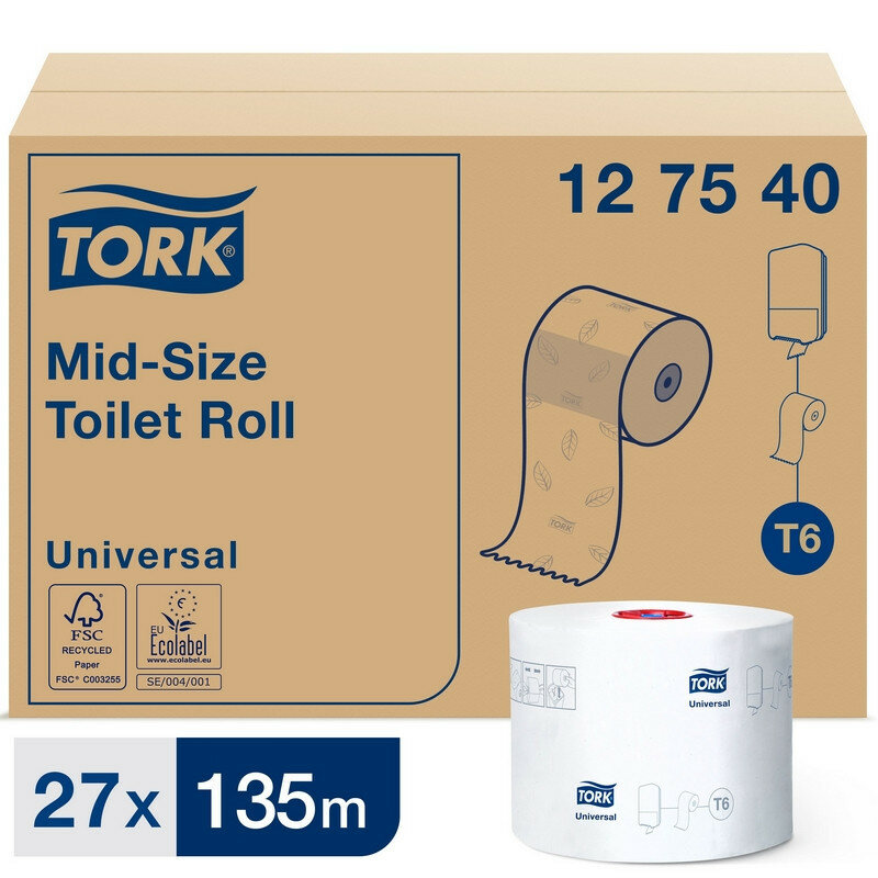 Бумага туалетная в рулонах Tork Mid-size Universal T6 1-слойная 27 рулонов по 135 метров (артикул производителя 127540)