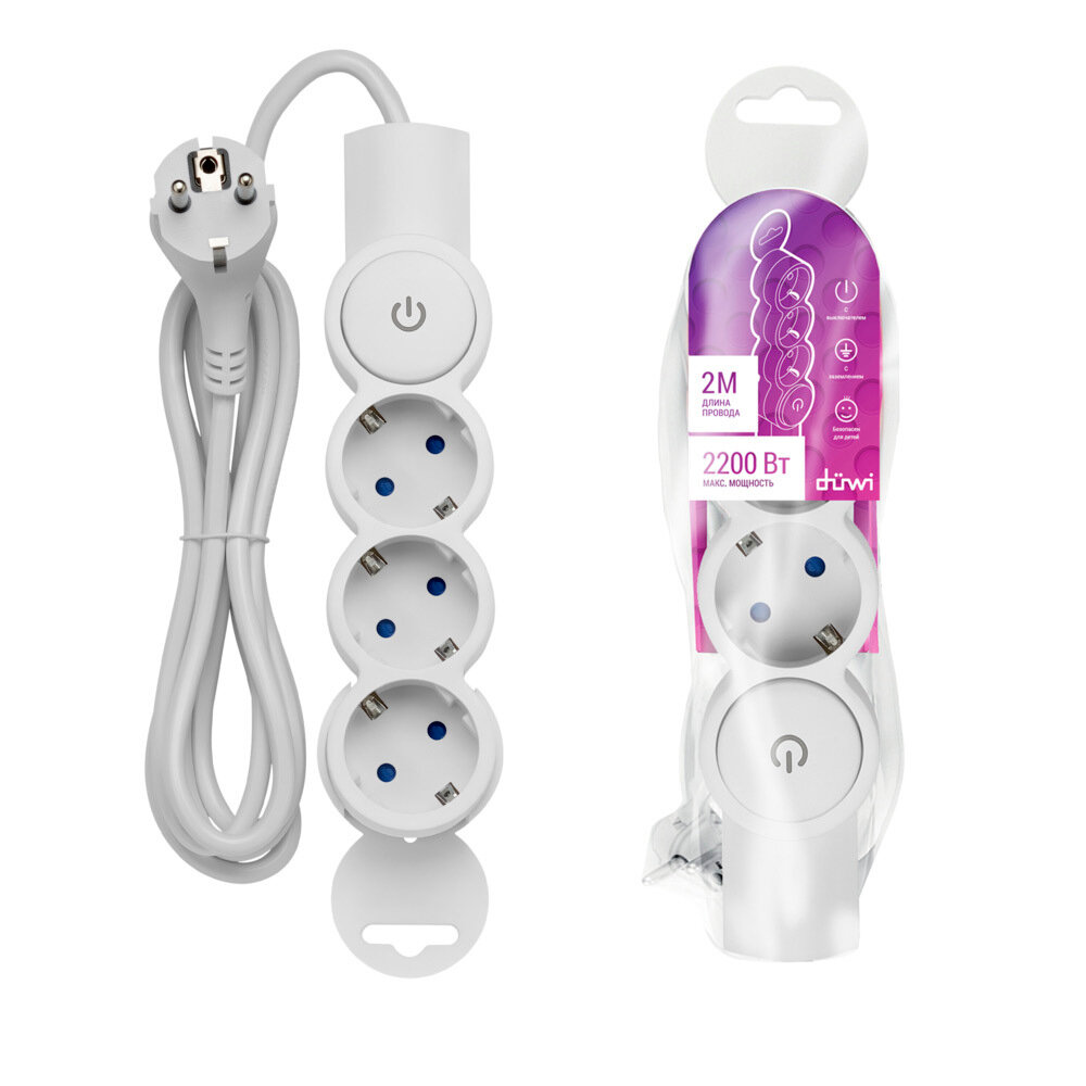 Удлинитель Duwi, 3 розетки, 2 м, 10 А, 2200 Вт, ПВС 3х0.75 мм2, с з/к, с выключателем, белый