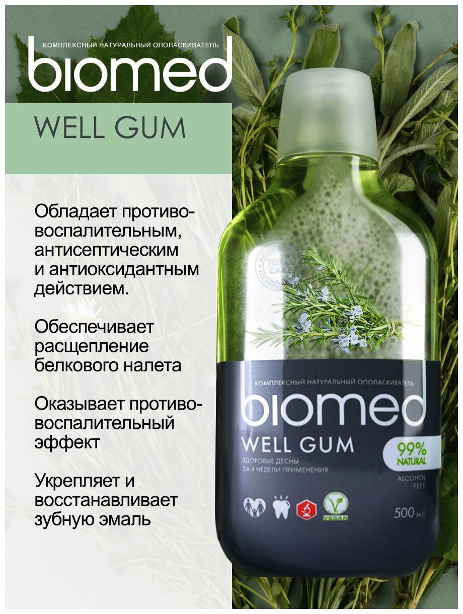 Ополаскиватель для полости рта Biomed Well Gum без фтора, противовоспалительный, антисептический, антиоксидантный, 500 мл