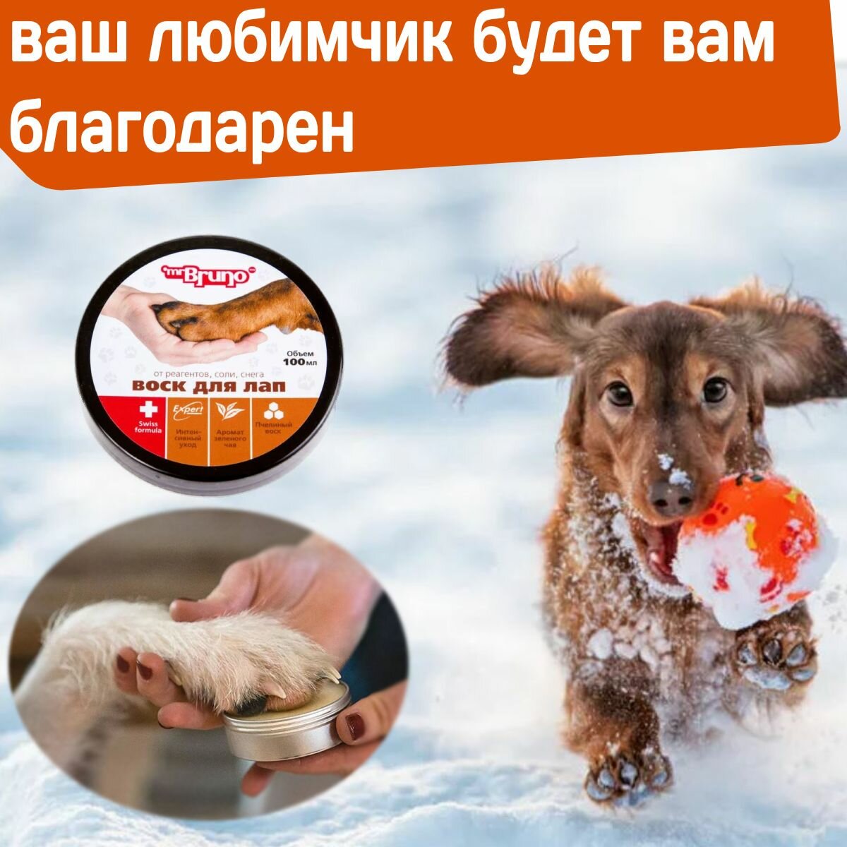 Защитный воск для лап собак и щенков Mr. Bruno от грязи, снега и реагентов, 100 мл