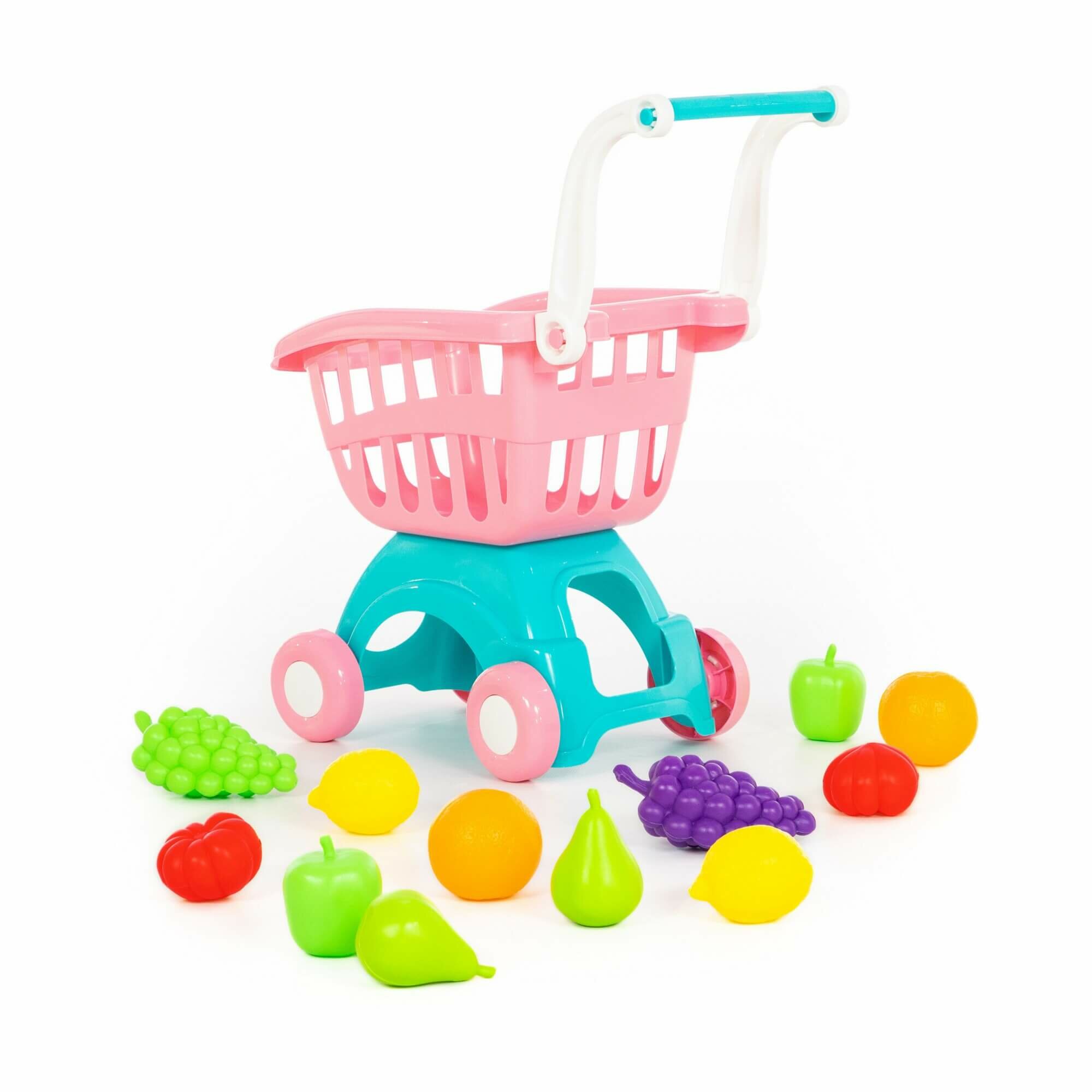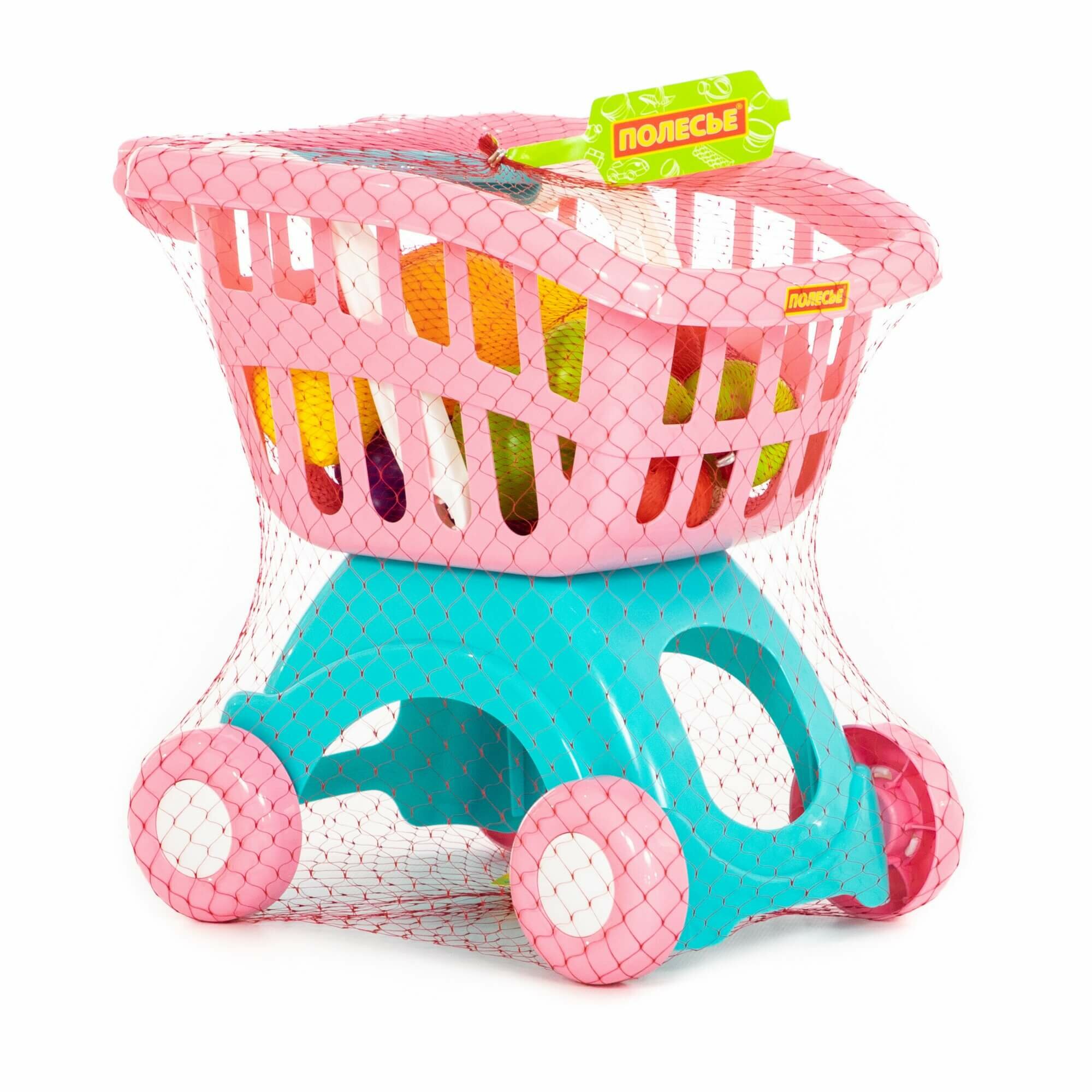 Игровой набор Полесье Тележка для маркета Мини, розовая с набором продуктов №15 (12 предметов) в сеточке П-71392/розовый