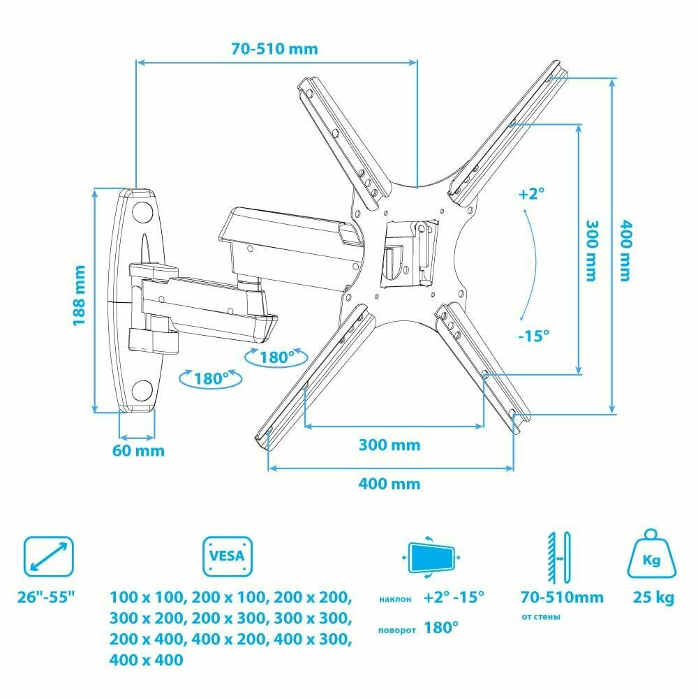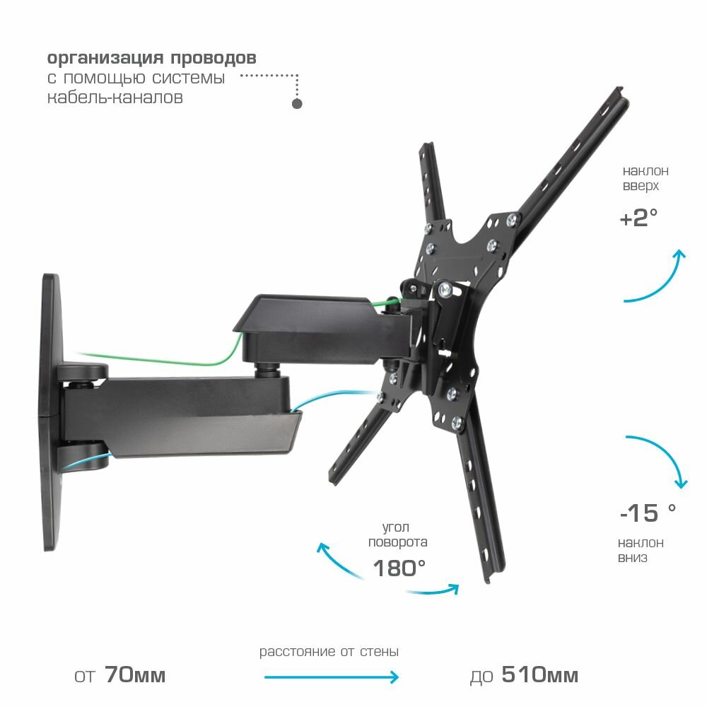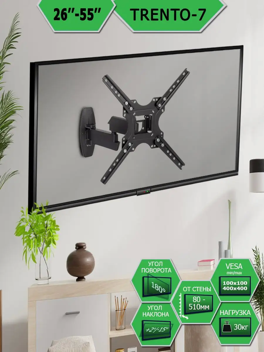 Кронштейн для телевизора настенный VLK TRENTO-7 / до 55 дюймов / до 25 кг / vesa 400x400 / наклонно-поворотное крепление для тв / держатель для телевизора