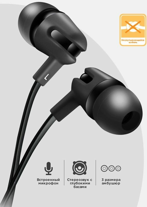 Купить Стереонаушник с микрофоном, плоский кабель 1,2 м, черны