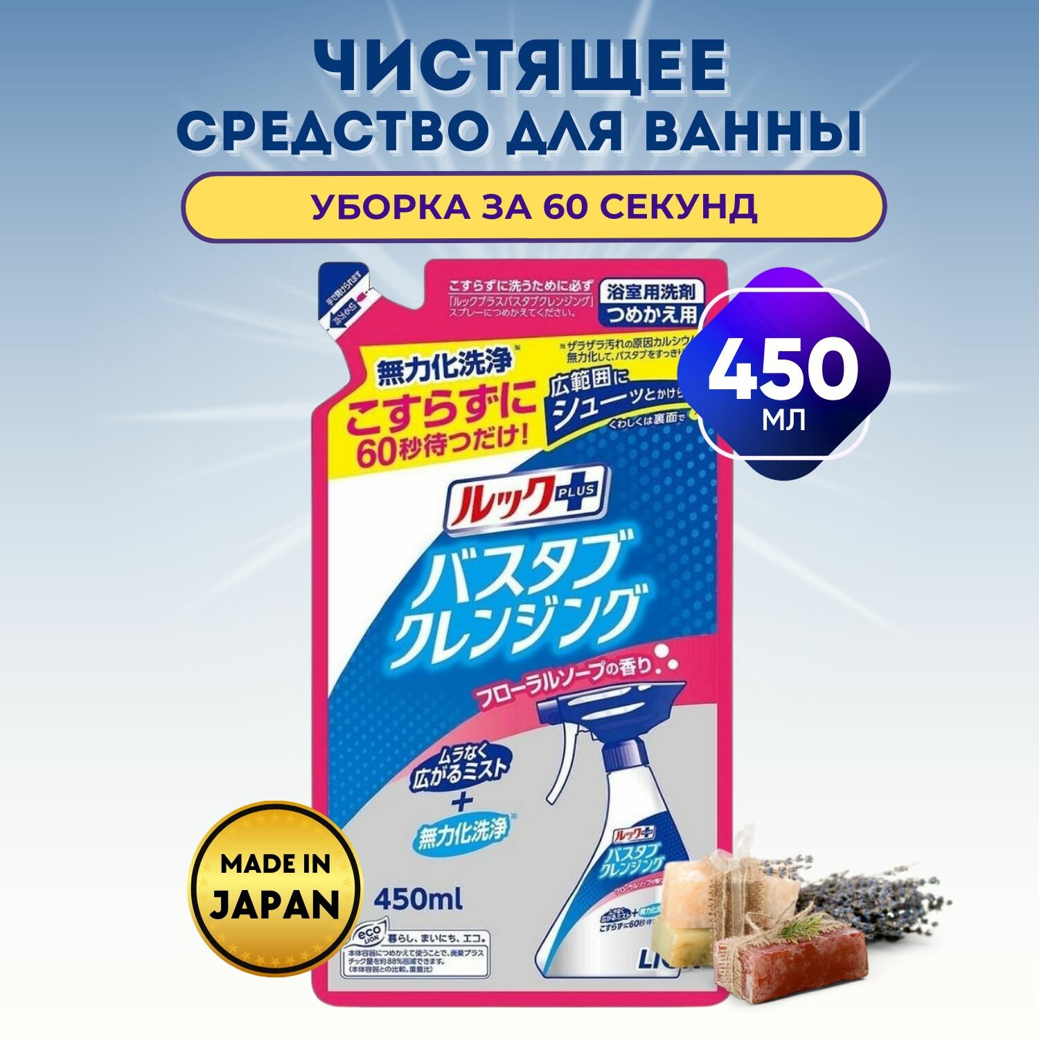 LION "Look Plus" Чистящее средство для ванной комнаты быстрого действия с ароматом мыла, 450 мл мягкая упаковка