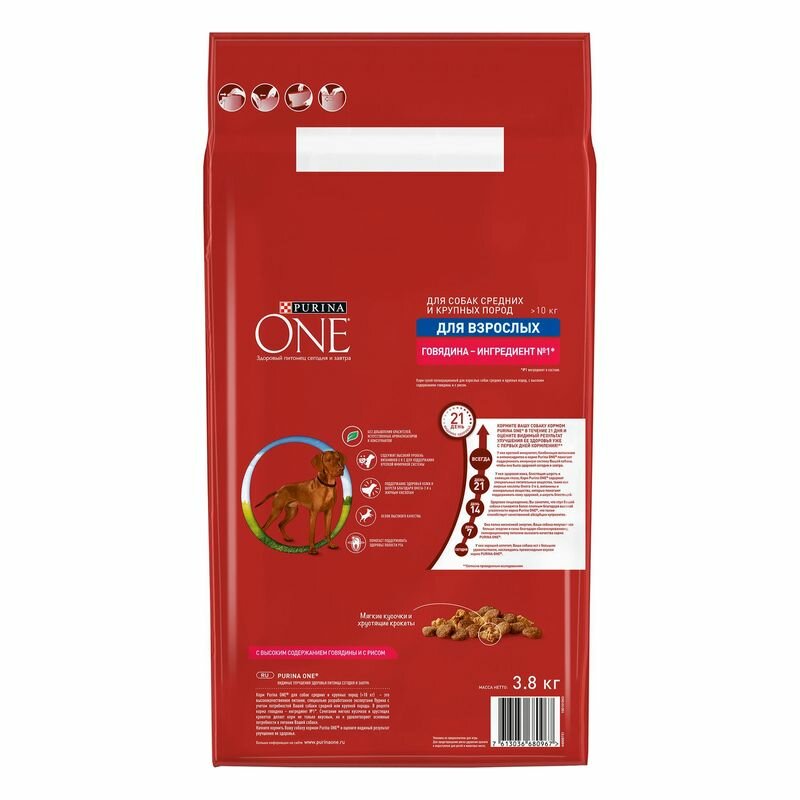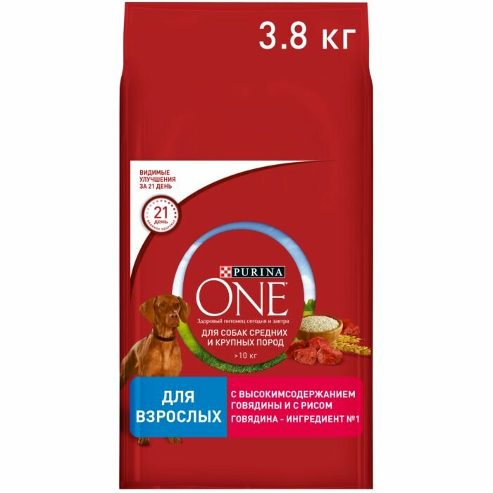 PURINA ONE 3,8 кг сухой корм для взрослых собак средних и крупных пород, с высоким содержанием говядины и с рисом