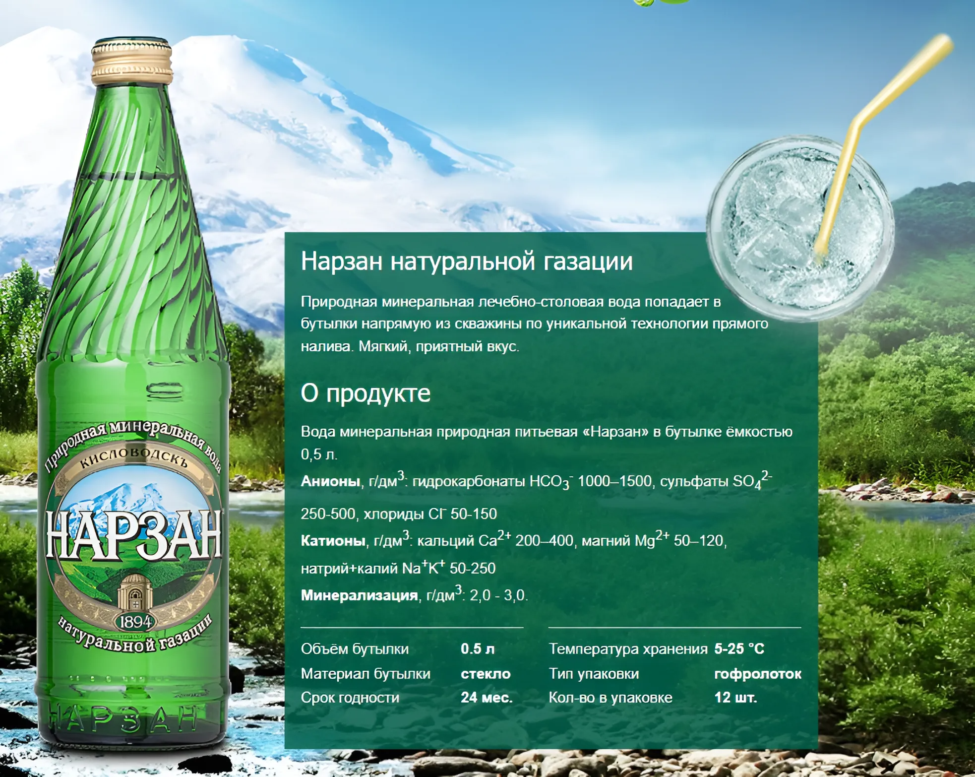 Минеральная лечебно-столовая вода Нарзан натуральной газации, стекло (0,5л*12шт)