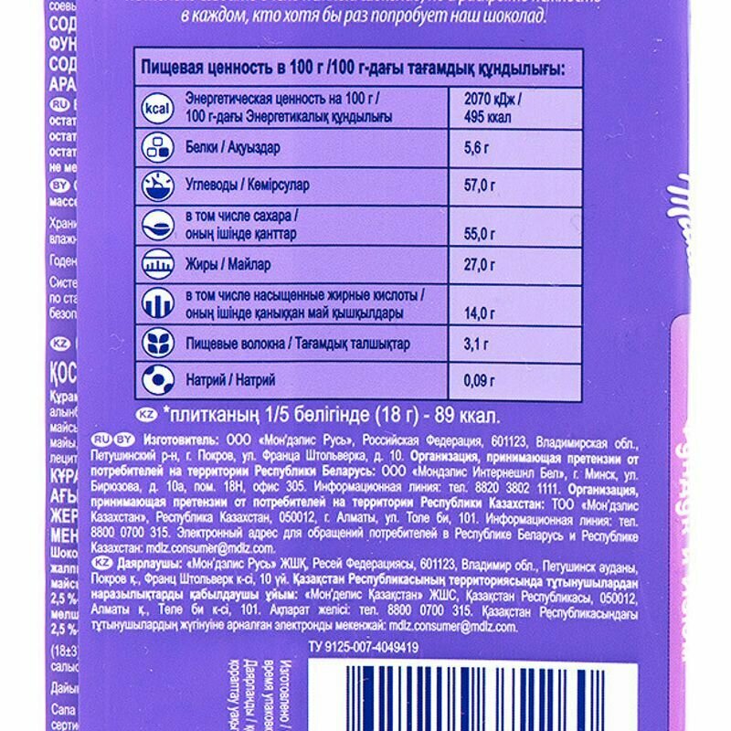 | Вид шоколада | молочный |