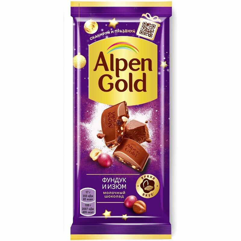 Шоколад Alpen Gold молочный с фундуком и изюмом, 85 г, 21 шт. в уп., 21 уп.