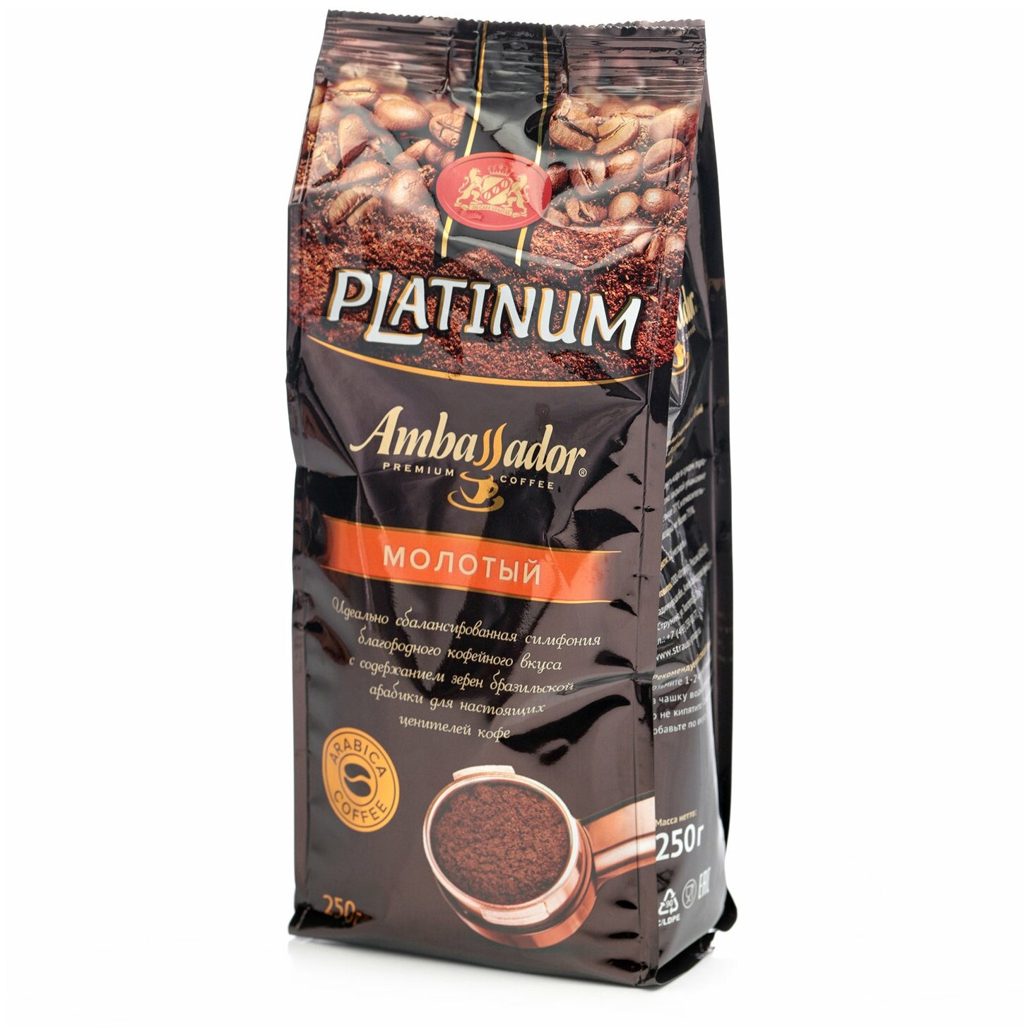 Кофе молотый AMBASSADOR "Platinum", 100% арабика, 250 г, вакуумная упаковка В комплекте: 1шт.