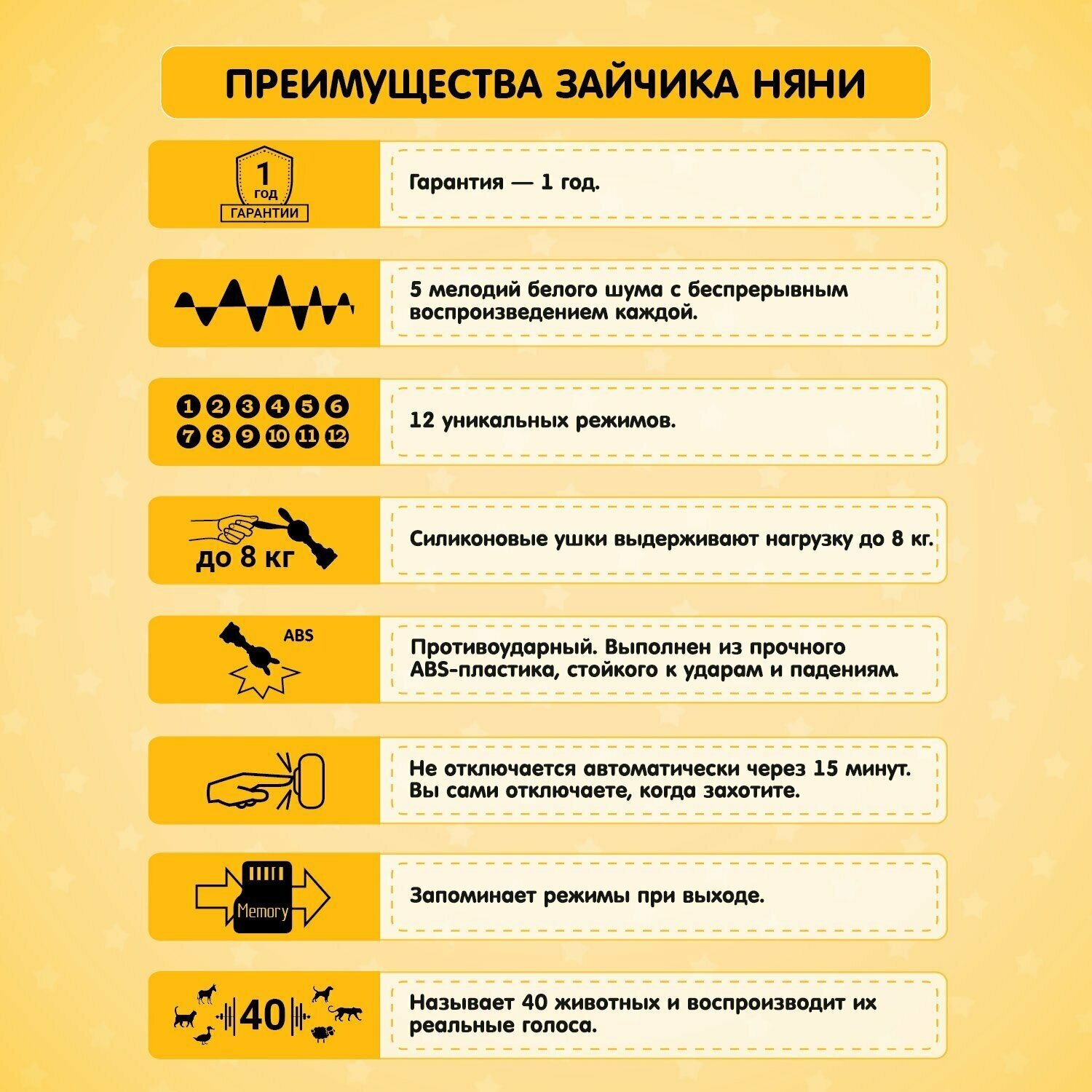 | Отзыв: | Увидела зайчика няню в соцсети instagram и решила заказать своему новорождённому ребёнку. Так как мы очень музыкальных, то это было моим спасением. У зайчика тираний 10 режимов: белый шум, погремушка, колыбельная, детские песни. Малышу очень нравится грызть резиновые ушки, дёсенки точит))) |