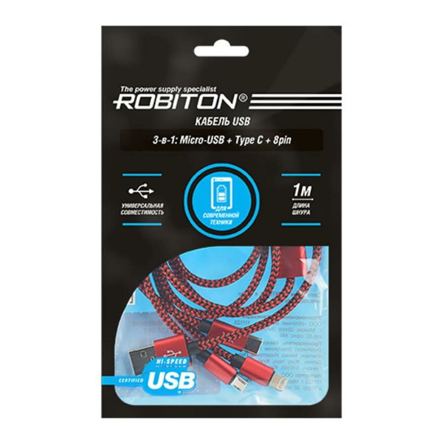 Купить Кабель USB Robiton P12 Multicord : Micro-USB + Type-C + 8pin (Lightning), 1м красный