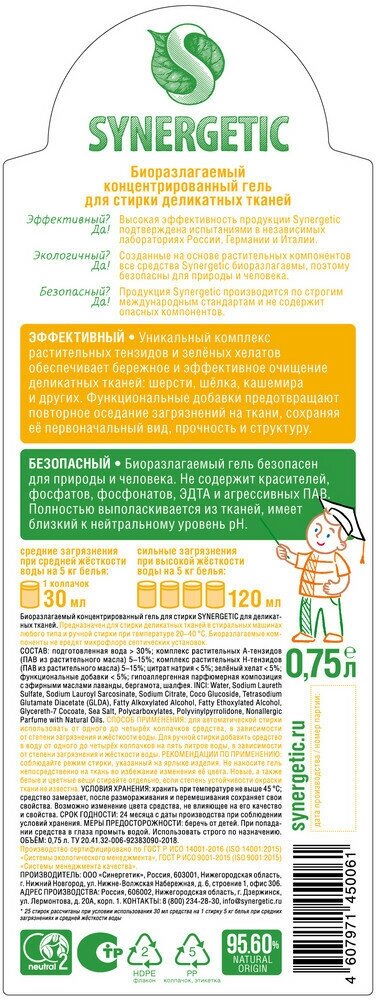 Гель для стирки Деликатных тканей 750мл - Synergetic [4607971450061]